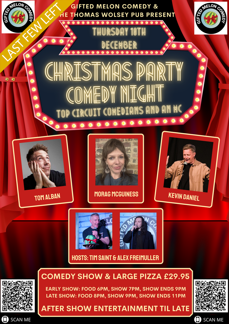 A Christmas Party with a difference, A delicious large Mylo's pizza and then a stand up comedy club night. 4 of the best circuit comedians and an MC - with entertainment in the bar downstairs afterwards until late.