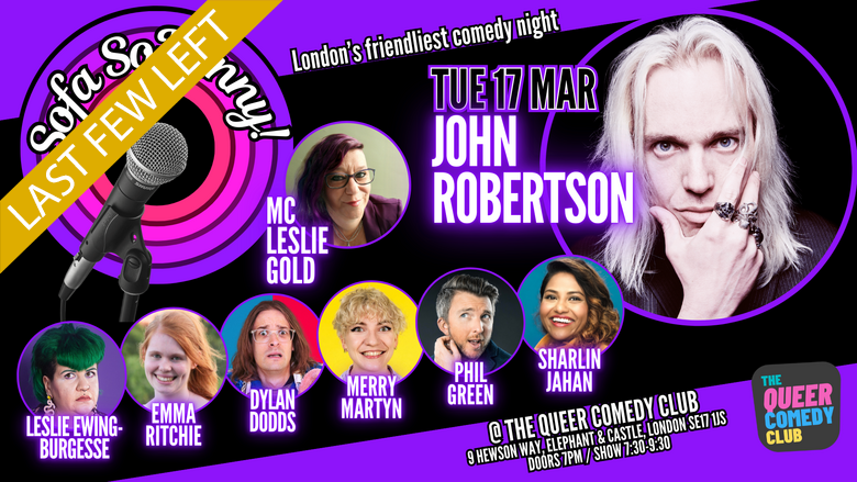 TweetSofa SoFunny at The Queer Comedy Club, featuring Mr John Robertson - comedian, improviser, presenter, streamer, viral sensation, human hurricane, live action videogame master. Yeah, that one.