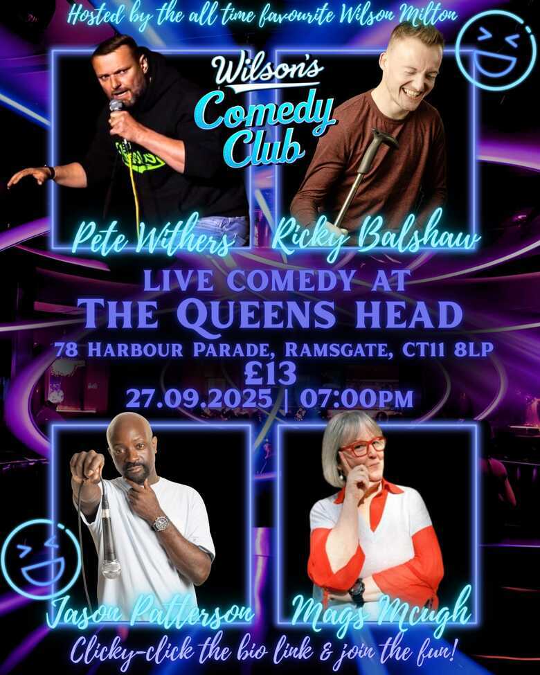 Looking for the ultimate night out in Ramsgate? Wilson’s Comedy Club is back at The Queens Head, Ramsgate, with a line-up packed full of top-class comedy and live music — all in one venue.