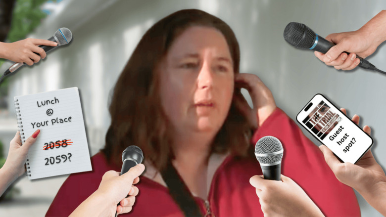“Hi Erin, just wondering if you saw the Google Calendar invite I sent you for a guest appearance on Wednesday, September 8, 2058? Let me know if 12:30 works, I can be flexible,” shouted one junior producer as Patterson’s police escort drove by.