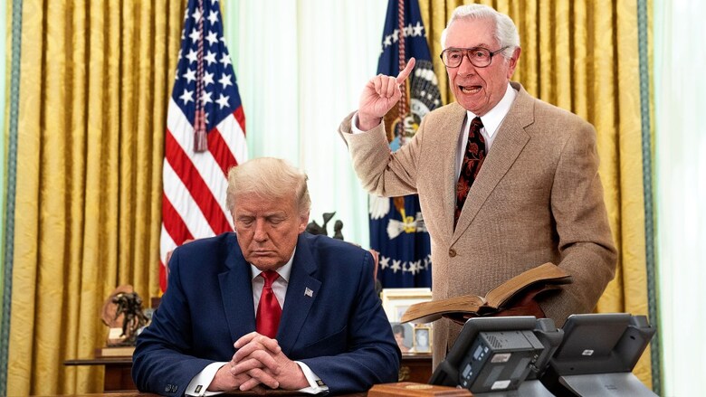 WASHINGTON—Although the mysterious stranger has been spotted both on Air Force One and at Mar-a-Lago, an administration official confirmed Wednesday that nobody in the White House was sure who the guy praying over President Donald Trump is. “All anyone knows about this dude is that he showed up at a meeting with the Pentagon top brass a few weeks ago to lead a prayer, and he’s been by the president’s side ever since,” said the official, who spoke to reporters on the condition of anonymity, adding that the man often appears to be in a trance and speaks in tongues while hovering his hands above Trump’s head. “When journalists asked about his identity, the press secretary called them enemies of the state who need to mind their own damn business, but the truth is we don’t have a clue who this man is or if he might be dangerous. No one in the media, the FBI, or even the general public has been able to put a name to the face. The Secret Service has confiscated, like, six snakes from the guy, but he keeps showing up with more and is always handling them in the Oval Office.” At press time, Trump had reportedly appointed the mysterious stranger as the new head of the Federal Reserve.