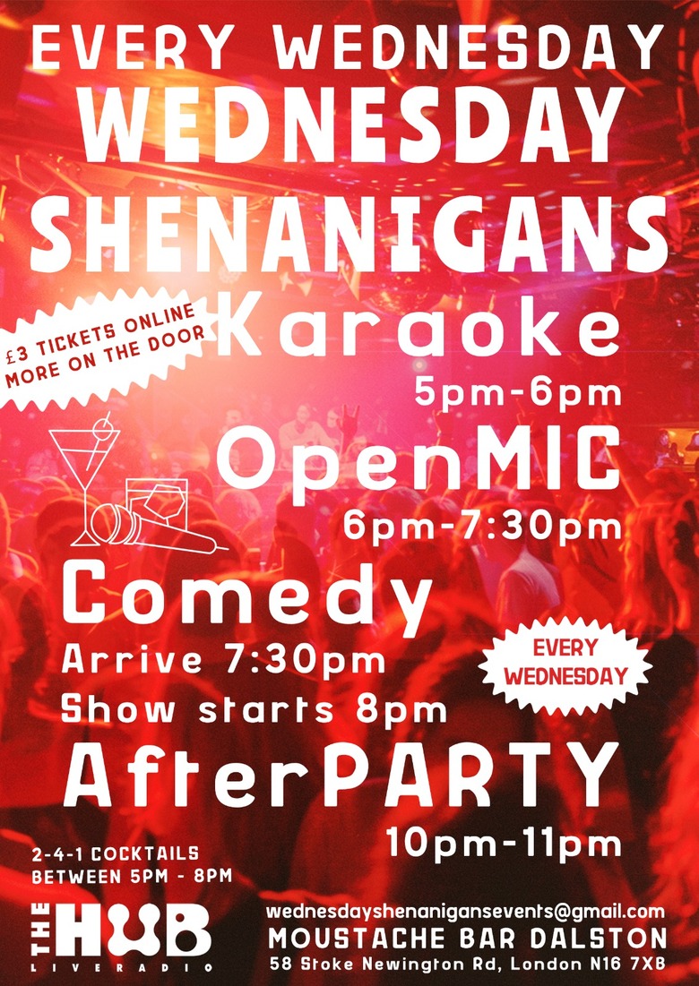 It’s a comedy night every Wednesday (sometimes fortnightly) at the iconic Moustache Bar in Dalston, featuring up-and-coming comedians—essentially a lively, friendly open‑mic vibe .