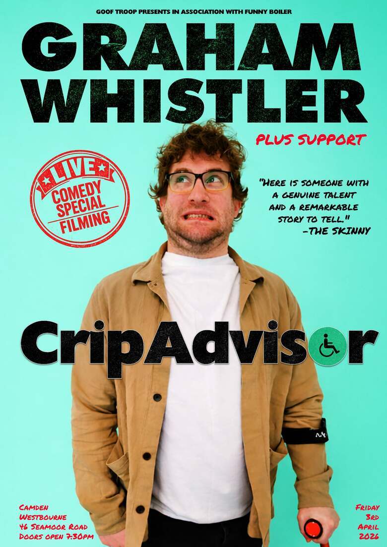 Graham Whistler had to cancel his tour in 24/25 after suffering a spinal cord injury. A year on from his surgery, now he's back with his hilarious solo show, CripAdvisor. Sex, travel & Cerebral Palsy: this hilarious hour of standup comedy is 10 years in the making and is being performed live for one night only for the last time!