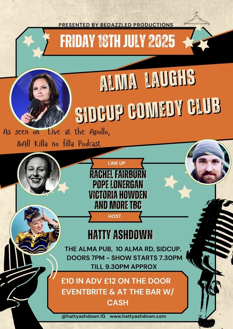 Get ready to laugh your socks off at Alma Laughs Comedy Club, hosted in the heart of Sidcup at the much-loved Alma Pub! We’re back on Friday 18th July with another top-tier night of stand-up – and you’re invited!