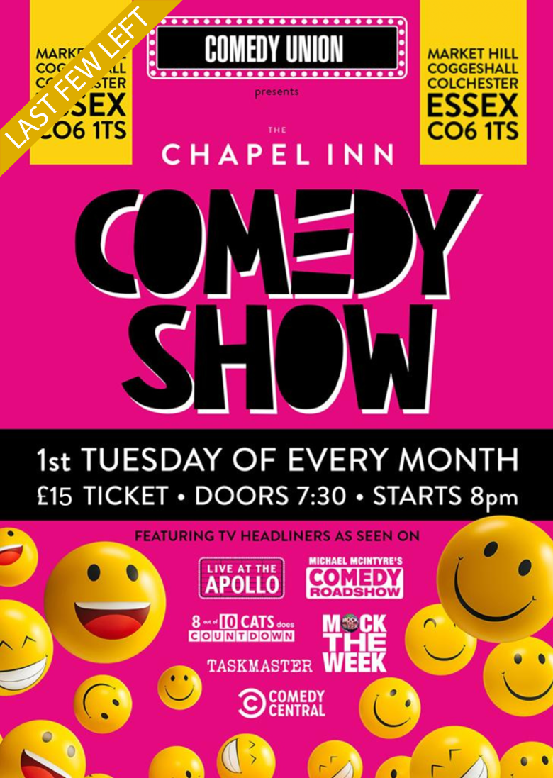 Live Stand Up Comedy on the 1st Tuesday of every month at your local pub in Coggeshall. Expect to see seasoned TV professionals performing alongside the hottest emerging stars on the circuit today. Your host Craig Smalls brings a different lineup each and every month which promises to leave you laughing so hard your face will hurt the next day. The Chapel Comedy Show is a community where we share stories, laugh and celebrate the magic of comedy together. Food is available before the show, please pre order with the venue