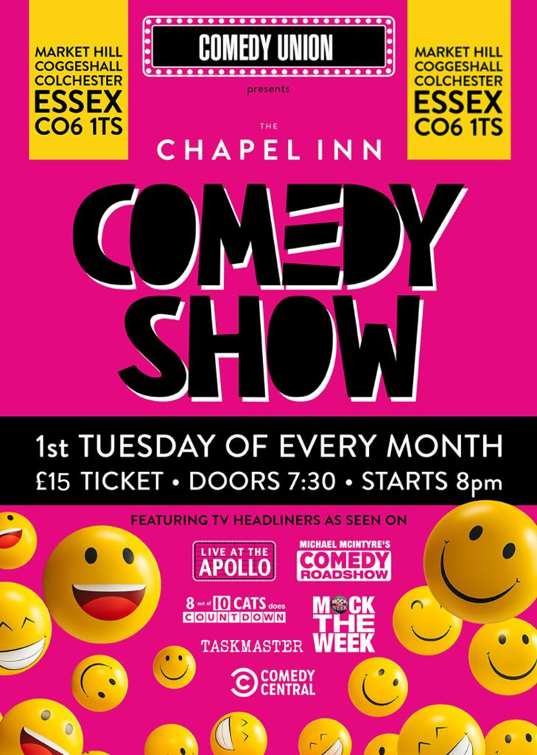 Live Stand Up Comedy on the 1st Tuesday of every month at your local pub in Coggeshall. Expect to see seasoned TV professionals performing alongside the hottest emerging stars on the circuit today. Your host Craig Smalls brings a different lineup each and every month which promises to leave you laughing so hard your face will hurt the next day. The Chapel Comedy Show is a community where we share stories, laugh and celebrate the magic of comedy together. Food is available before the show, please pre order with the venue