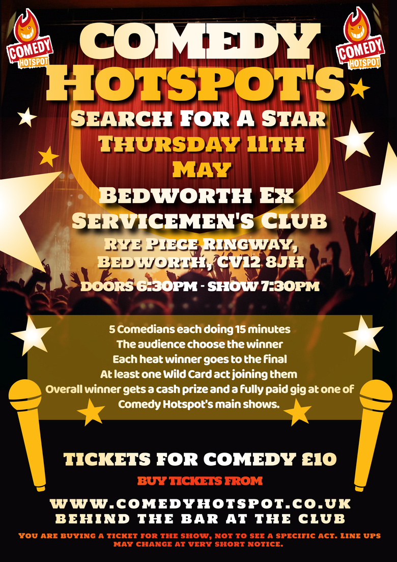 Tweet5 comedians will battle it our for a place in the final of the Midlands Search For A Start by Comedy Hotspot. You the audience decides who those finalists will be, and the overall winner will get a cash prize and a paid slot on one of Comedy Hotspots big stages.