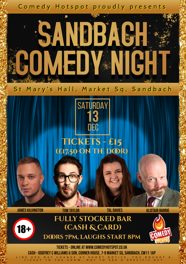 Comedy Hotspot continues to bring top class comedy to Sandbach, and St Mary's Hall on Market Sq. is the home of comedy in Sandbach. You can expect blockbuster line ups, comics who have been on TV, rising stars of British comedy all in a great venue with the same amazing looking stage set up. We have a cash and card bar with great service and great range, and all of it in the centre of Sandbach Town. 4 more brilliant comedians with CV's bursting once again with accolades.