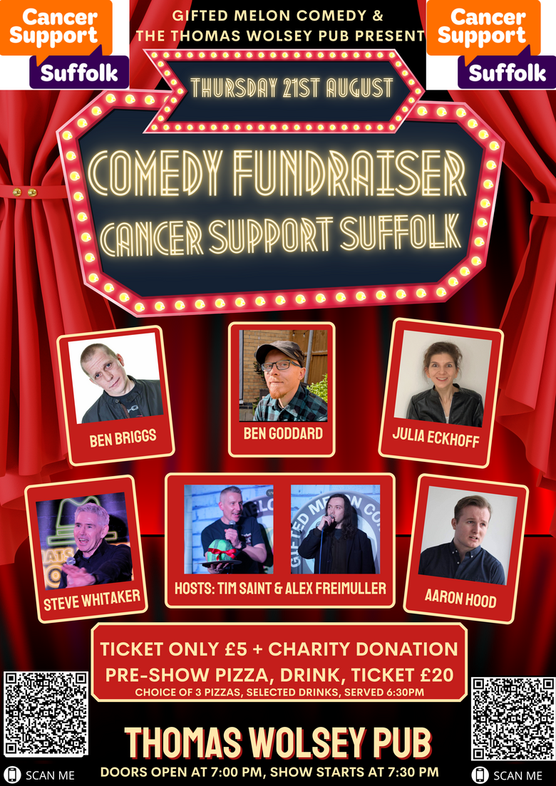 TweetThis month is our charity fundraiser - where we're bringing you a night of brilliant stand up comedy, and raising money for Cancer Support Suffolk! Tickets strictly limited - don't miss out.