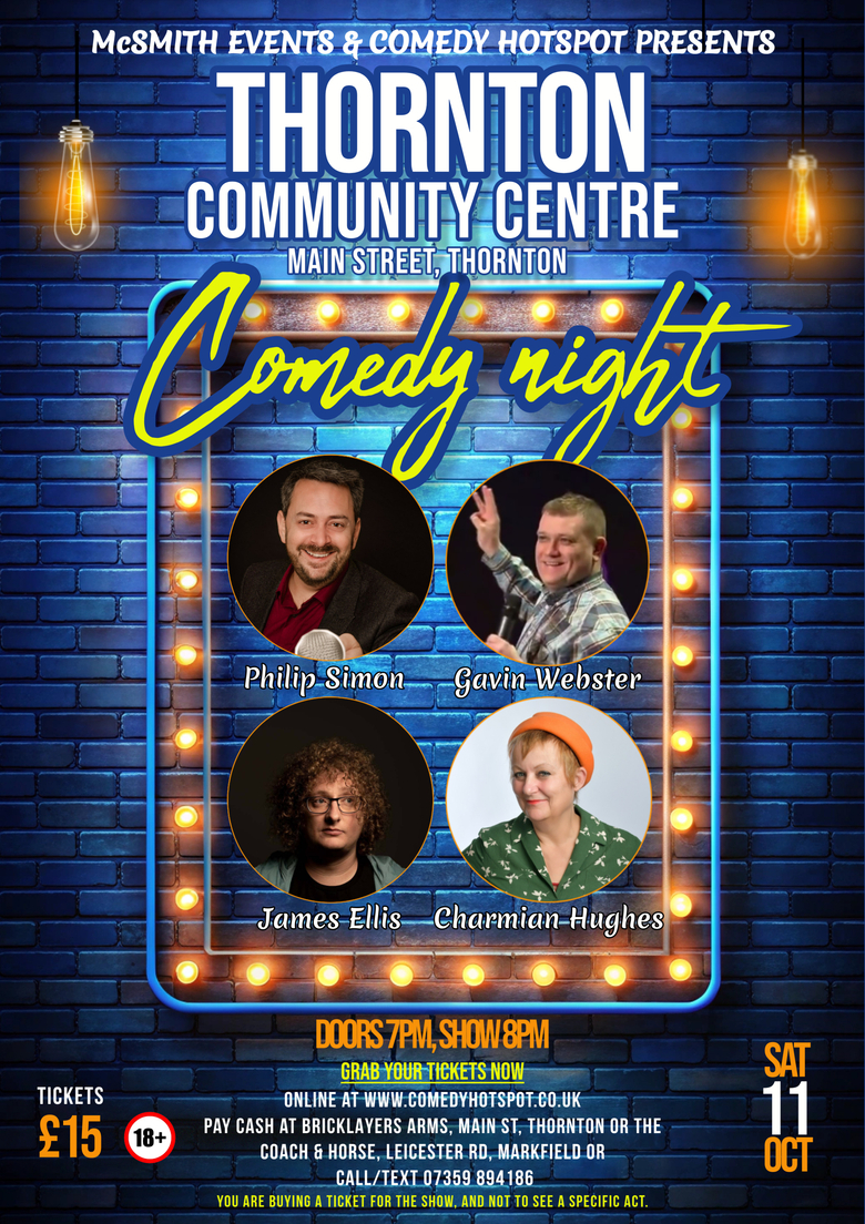 TweetComedy Hotspot only bring the very best comedians to their shows, and our show at Thornton Community Centre is no exception. A line up of varied styles, who are all hilarious in their own right. TAdd a wonderful audience to that and it only means one thing, a superb night of live comedy. We will run the evening like a professional comedy club, ensuring we have the best possible atmosphere and conditions for live comedy.