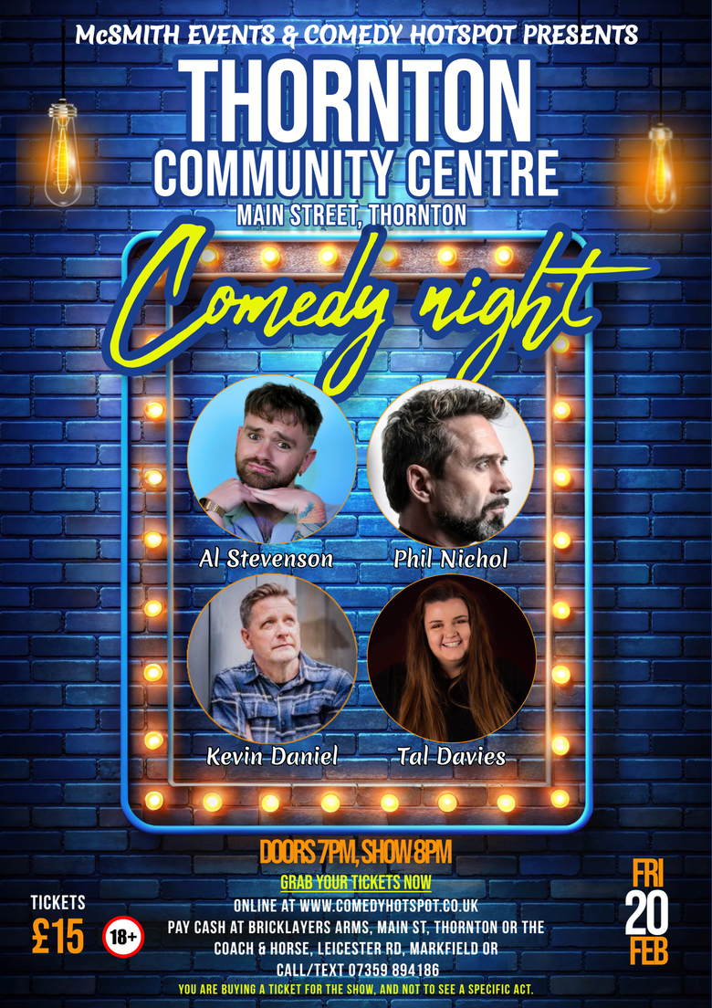 Comedy Hotspot only bring the very best comedians to their shows, and our show at Thornton Community Centre is no exception. A line up of varied styles, who are all hilarious in their own right. Add a wonderful audience to that and it only means one thing, a superb night of live comedy. We will run the evening like a professional comedy club, ensuring we have the best possible atmosphere and conditions for live comedy.