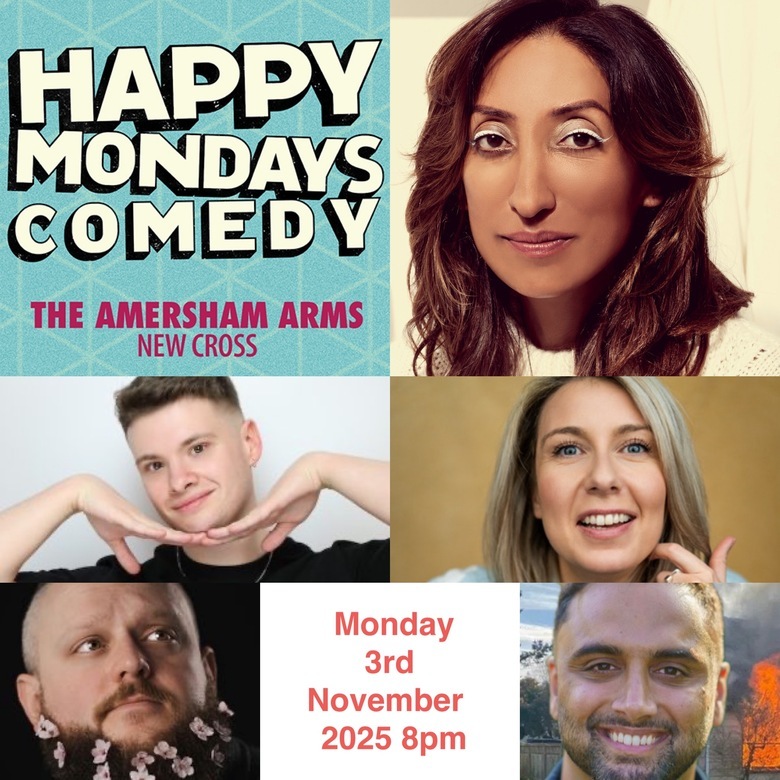 Legendary Happy Mondays Comedy bring you weekly live comedy, kick off your week in style , come hear brand new jokes & fresh ideas from stars of TV, Radio & comedy circuit & beyond. Don't miss chance to see comedy circuit legend and star of tons of TV- Shazia Mirza : As seen on BBC's 'QI' & "Have I Got News for You" C4's 'Celebrity Island with Bear Grylls', ITV's Jonathan Ross Show, C4's "Travel Man" " Would I Lie to You?" & much more..., Adam Jamal- experienced Canadian comedian , Rhys Thorne- LGBT disabled promising newbie , Greg Houston -selected to open for Tig Notaro & Doug Stanhope, Gabrielle Macpherson-2025 Best In Class Comedian Plus Special Guest TBC providing the lols all hosted by your cheeky compere Sion James in the friendly atmosphere of The Amersham Arms. ( Across the Road from New Cross station)