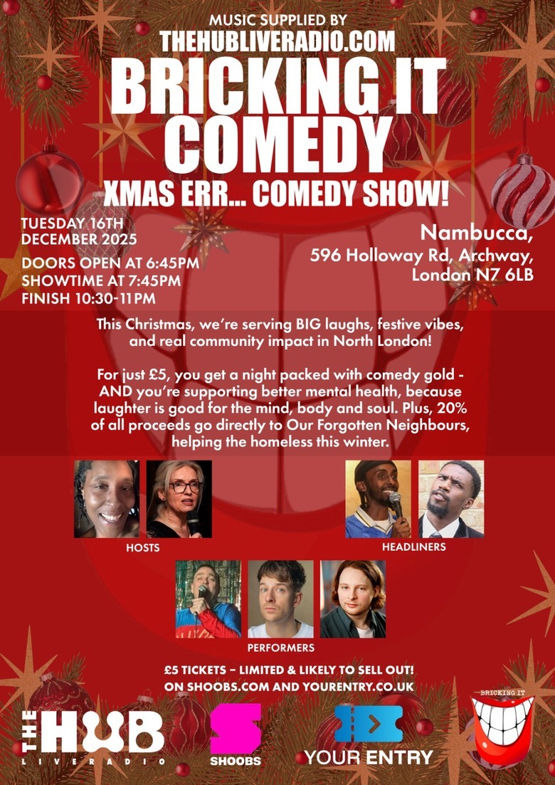 Get ready for a festive night of laughs at the Bricking It Comedy CIC Xmas Err… Comedy Show! Expect a high-energy comedy lineup, fun vibes, raffle prizes, giveaways and feel-good entertainment — all while supporting mental health and donating towards helping the homeless through Our Forgotten Neighbours CIC.