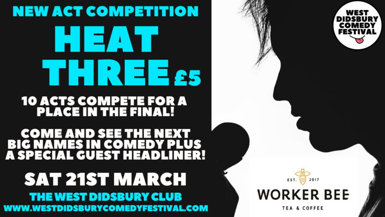 Heat Three of the West Didsbury Comedy Festival New Act Competition - Sponsored by Worker Bee Tea & Coffee!MC CHRIS BROOKER introduces 10 acts competing for a place in the final where ultimately the winner receives £250, a trophy and a shedload of kudos!Come see the stars of tomorrow, plus an excellent MC and our special guest MO HAROON!Just £5 - a bargain!Line up to follow. Watch this space!