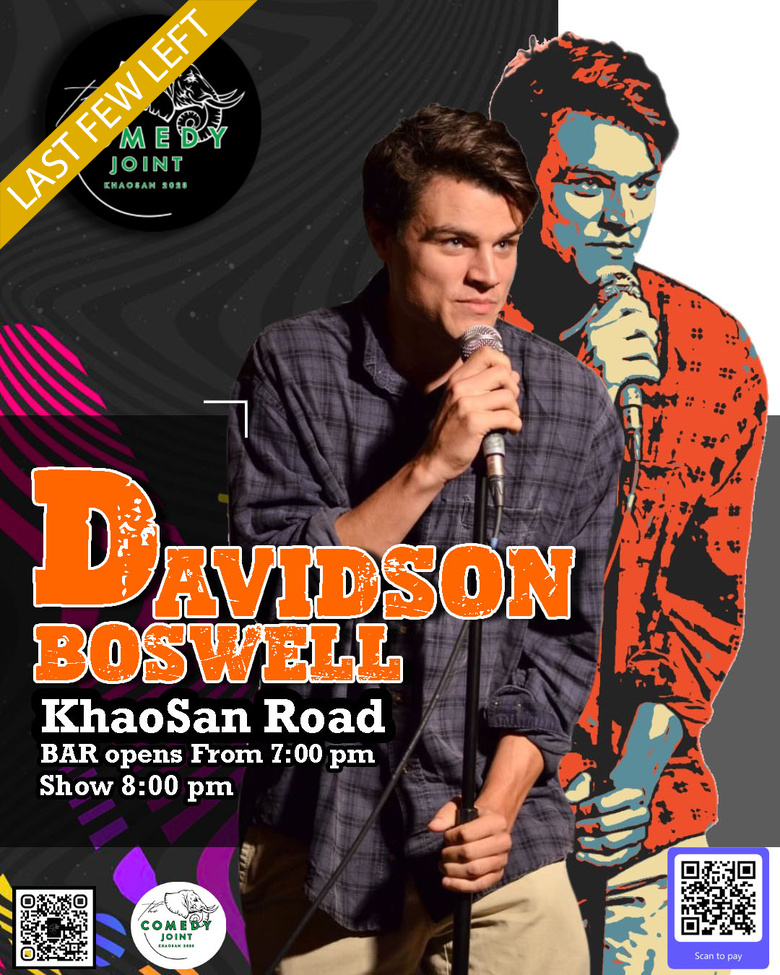 Davidson Boswell is a New York City based Standup Comedian and Actor who is living in Bangkok for the rest of 2023, performing at The Comedy Joint nightly. Along with performing all over the east coast of the United States, he has featured for MTV, National Lampoon, and The New Yorker. He could not be more excited for his residency at The Comedy Joint and is looking forward to seeing you there!
