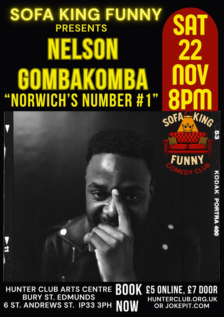 TweetWe are happy to announce we are being joined by Nelson T. Gombakomba Jr. on Saturday 22 November at our monthly comedy night with his new headlining show, “Norwich’s Number One”.