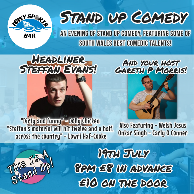 Join us for a hilarious night of stand up comedy at Towy Sports Bar, Carmarthen! Headlined by Steffan Evans and hosted by Gareth P Morris. Also starting Welsh Jesus, Onkar Singh and Carly o Conner