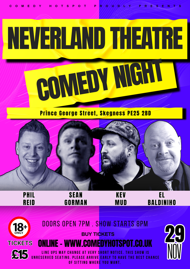 TweetComedy Hotspot are synonymous with top class comedy shows and I am excited to be bringing more shows to Neverland Theatre in Skegness. We have established the only professionally run Stand Up Comedy Club in Skegness and you can expect very high quality comics, a show run as a professional club, in a wonderful purpose built space. This event is unreserved seating so arrive early to get the seats you want.