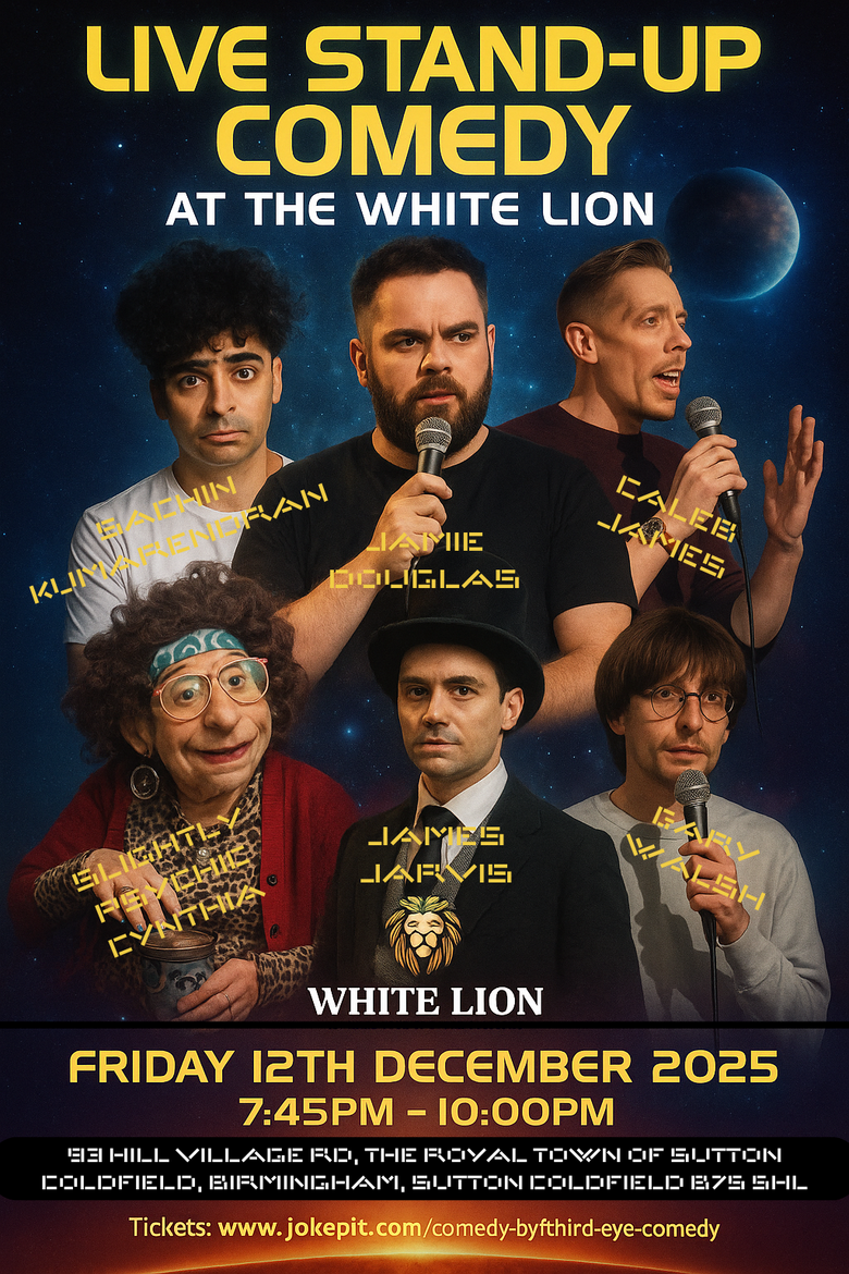 Join us at The White Lion for a live stand-up comedy night on Friday 12th December 2025. Expect a mix of experienced performers, fresh voices, and unique comedy styles. The show runs from 7:45pm to 10:00pm and offers a great chance to enjoy top-level entertainment in the heart of Sutton Coldfield.