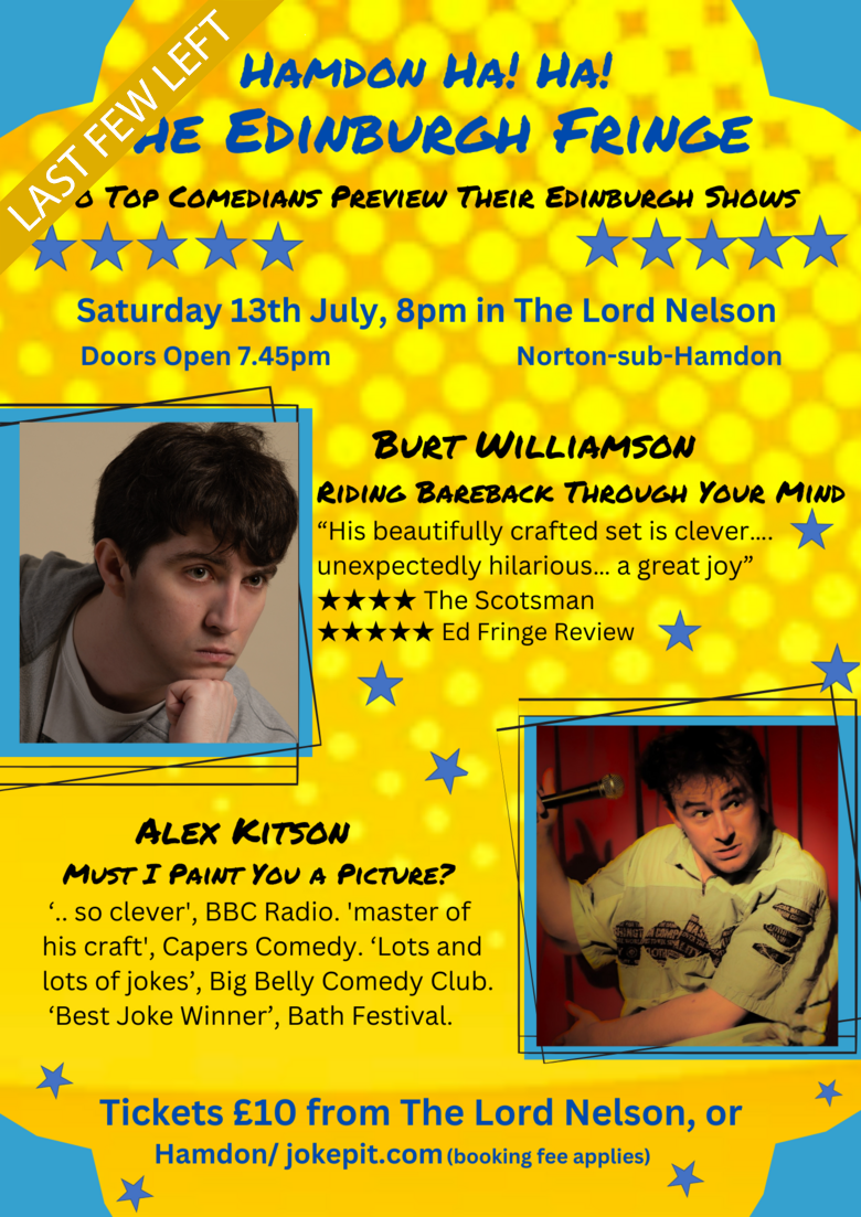 Join us at Hamdon Ha! Ha! for Edinburgh Fringe preview shows from @BURT WILLIAMSON and @ALEX KITSON . Laughter guaranteed.
