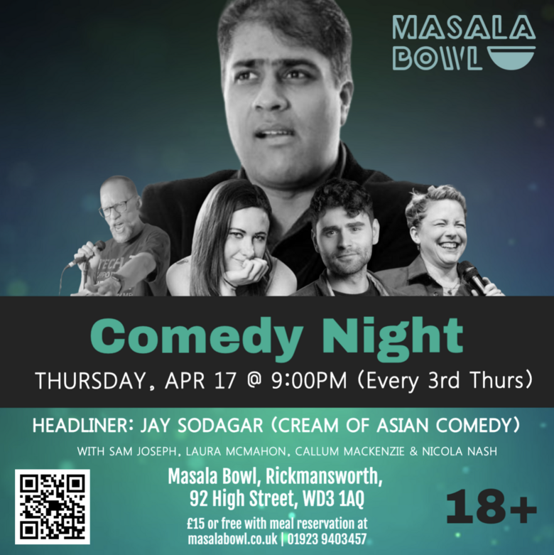 Dinner served from 7pm to 9pm when the show starts and we switch to a bar menu.  Book in for dinner at https://masalabowl.co.uk/ and see the comedy for free, or book in via JokePit for drinks and comedy from 9pm.